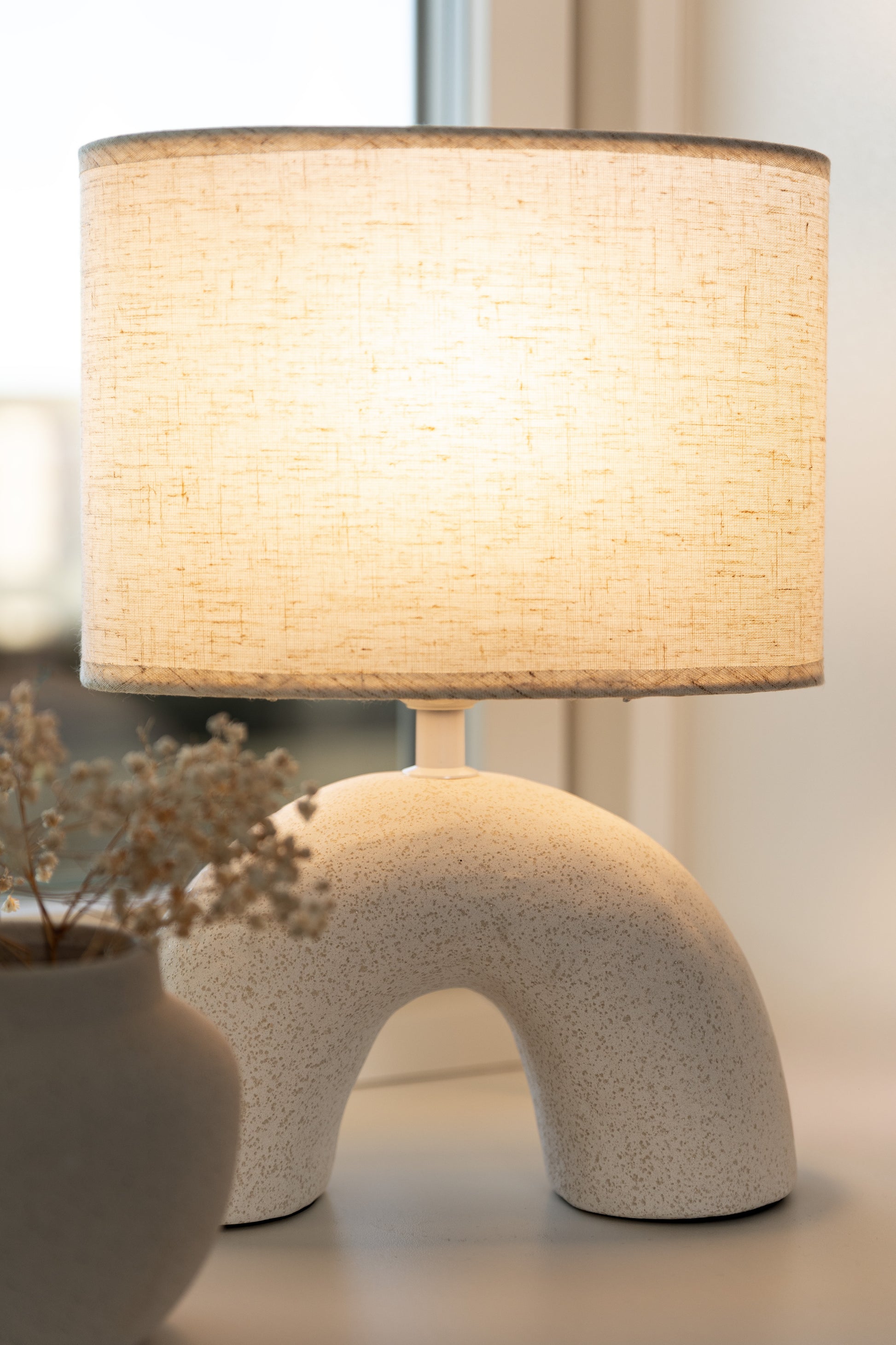 Bring et kunstnerisk touch til dit hjem med denne stilfulde bordlampe. Lampen er designet med en skulpturel fod i en knækket hvide finish, der minder om en moderne bueform, kombineret med en oval lampeskærm i stof.