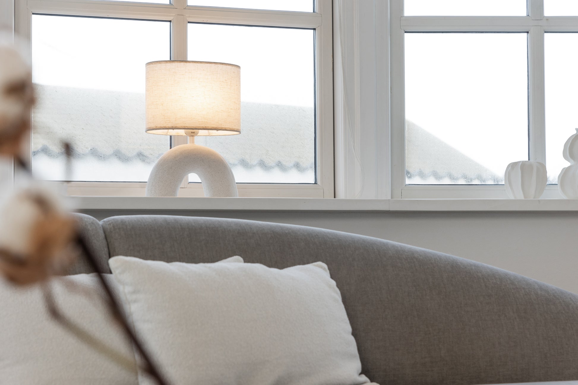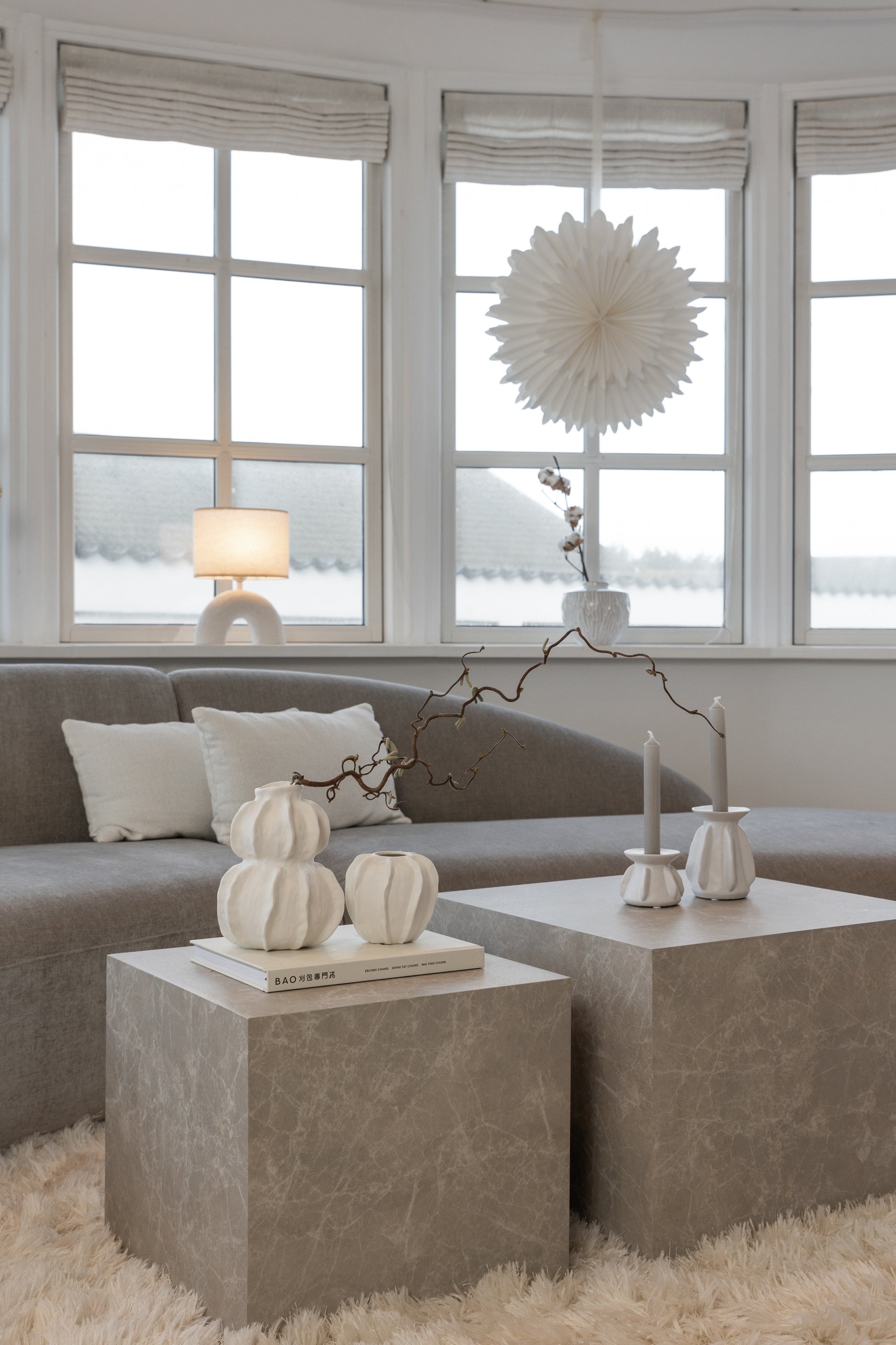Denne lampe kombinerer funktion og design og passer perfekt som en dekorativ lyskilde til stuen, soveværelset eller kontoret. Med sin unikke form og neutrale toner er den både et iøjnefaldende element og et alsidigt valg til forskellige indretningsstile.