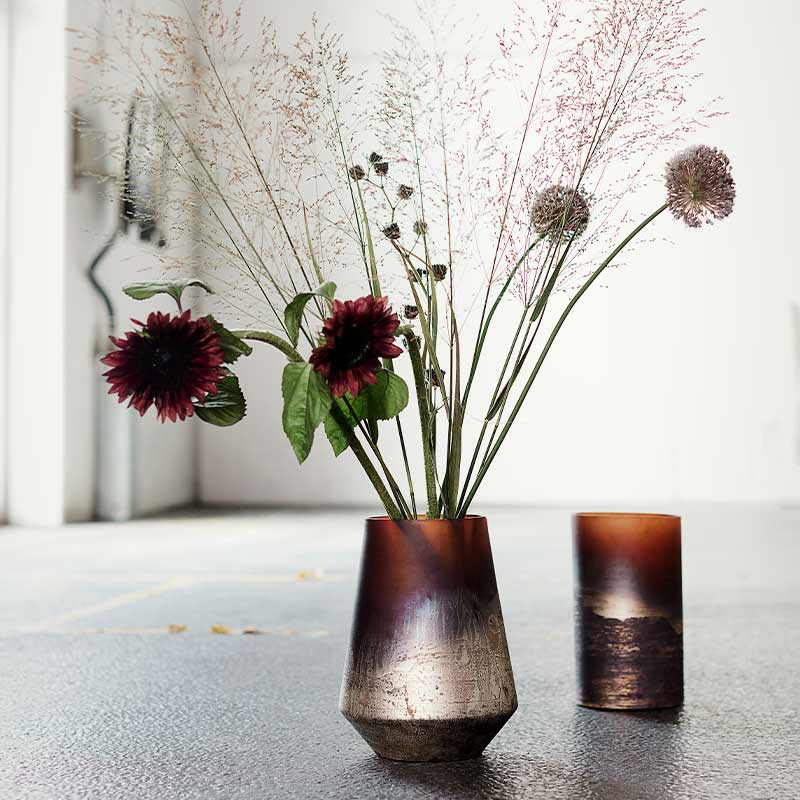 Med Lana tilføres indretningen en ekstra dimension af varme og elegance, når de anvendes til årstidens nyplukkede blomster. For at skabe en lun stemning, kan vasen anvendes som lanterne, der udsender et glødende lys gennem den guldbelagte overfalde og matterede glas.