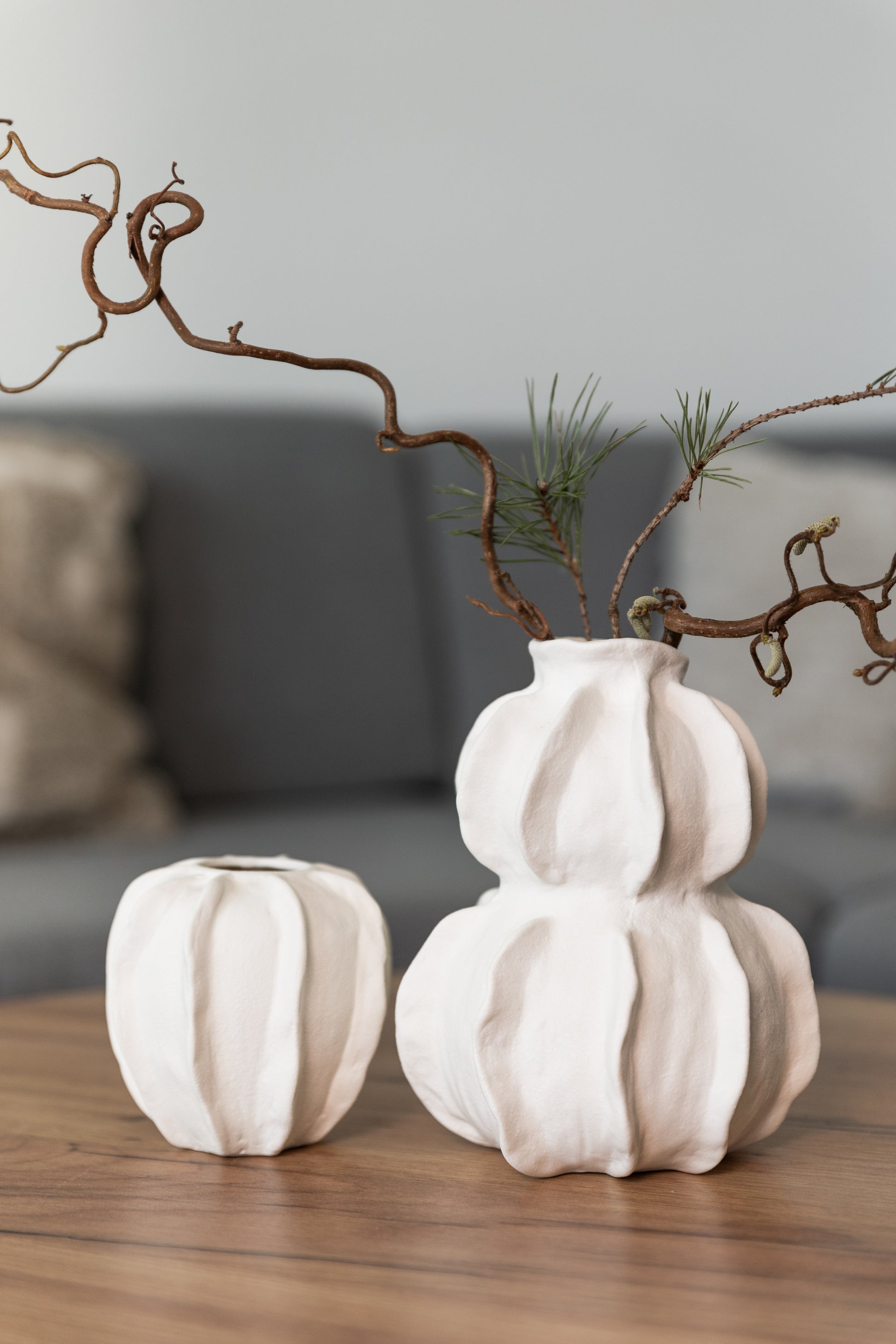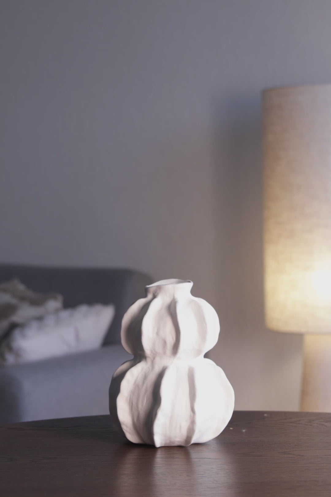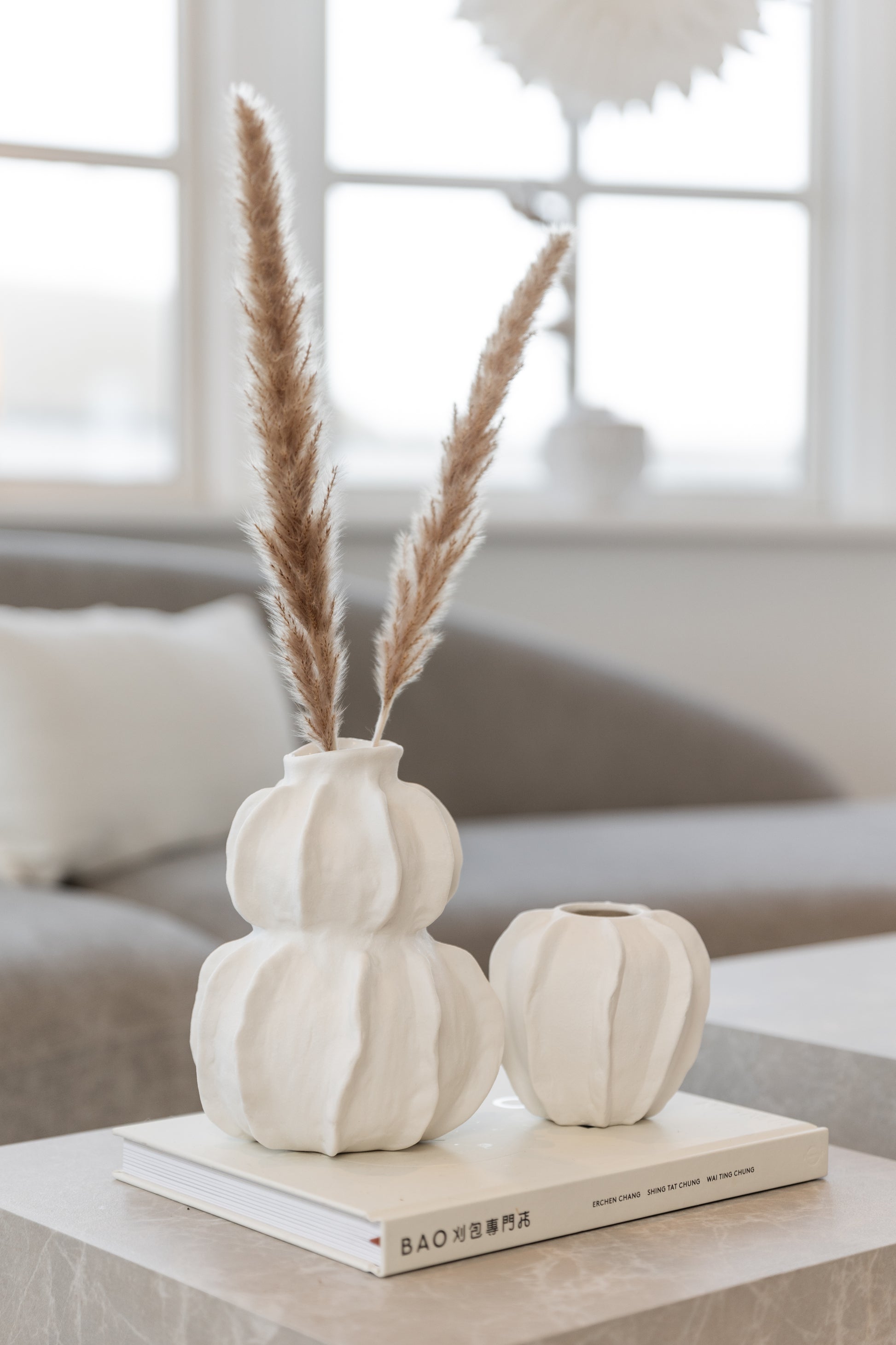 Giv dit hjem et kunstnerisk løft med denne imponerende dobbeltvase. Dens unikke, bølgende form minder om en blomst i fuld flor og skaber et dramatisk, men elegant udtryk. Den matte hvide overflade fremhæver vasens organiske silhuet og gør den til en ideel tilføjelse til moderne, minimalistiske eller boheme-inspirerede hjem.
