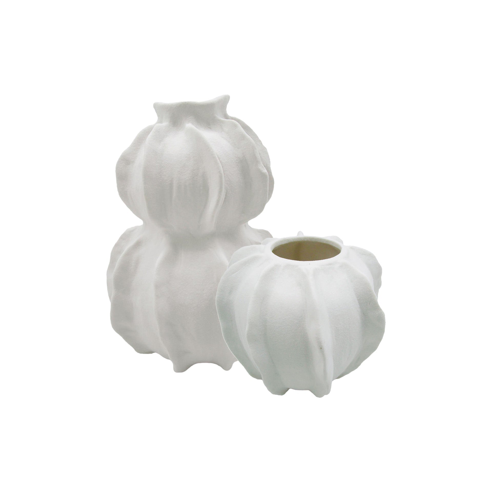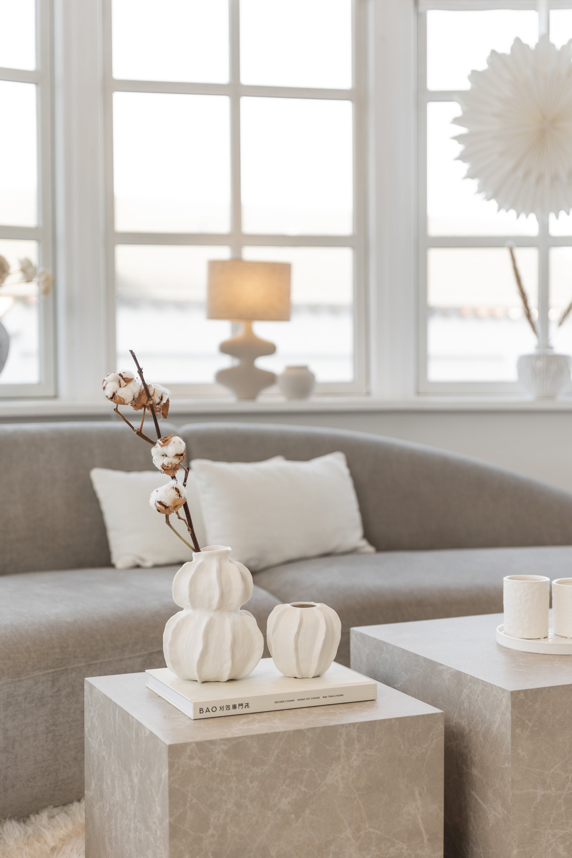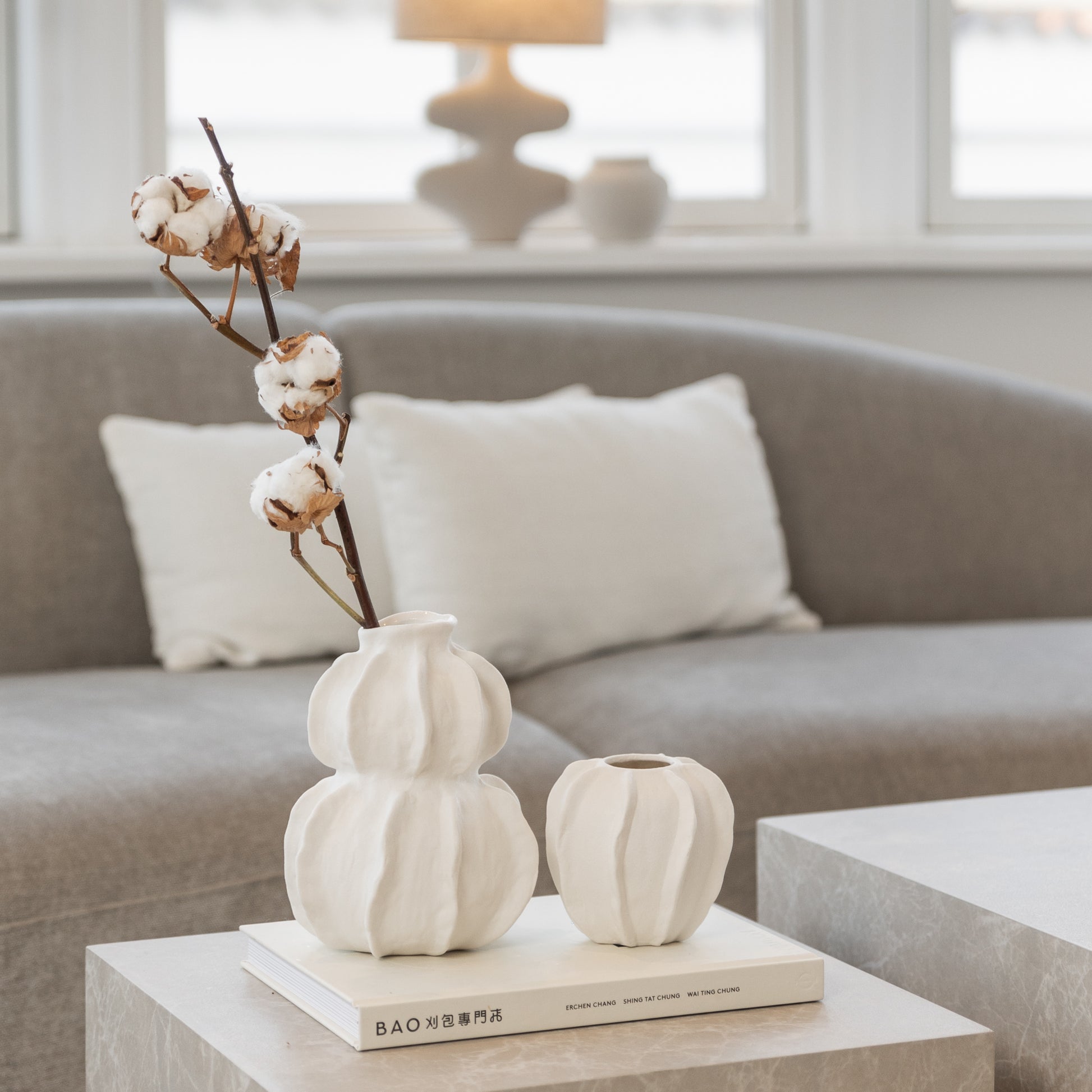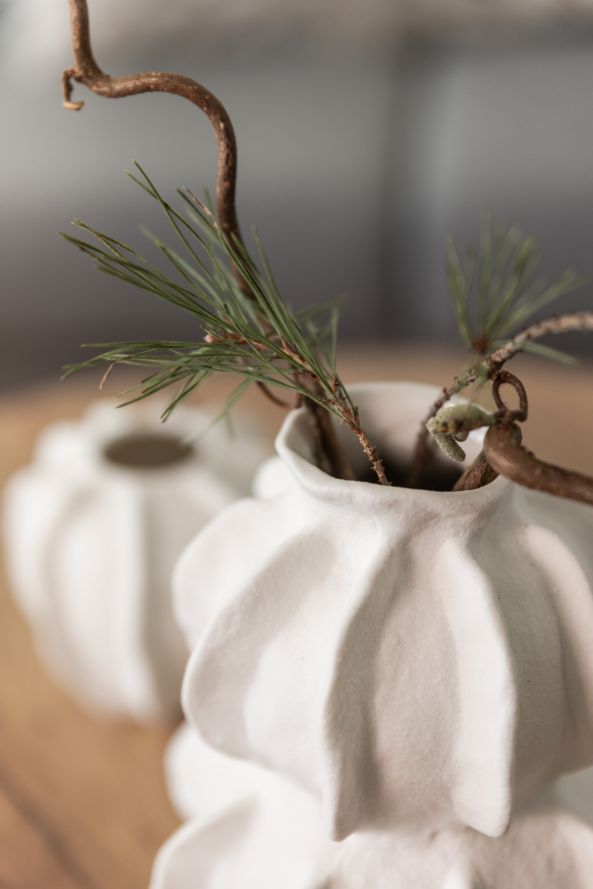 Giv dit hjem et kunstnerisk løft med denne imponerende dobbeltvase. Dens unikke, bølgende form minder om en blomst i fuld flor og skaber et dramatisk, men elegant udtryk. Den matte hvide overflade fremhæver vasens organiske silhuet og gør den til en ideel tilføjelse til moderne, minimalistiske eller boheme-inspirerede hjem.